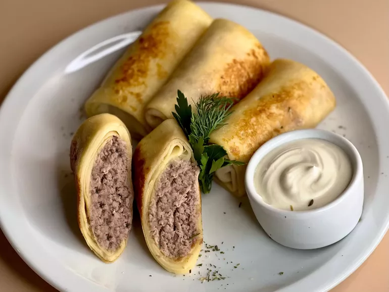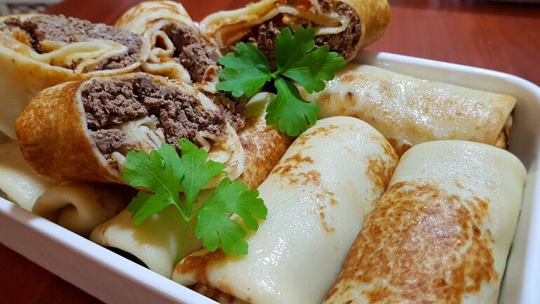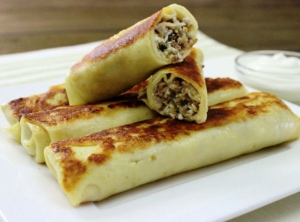 10. Диетическая начинка из нежной молодой говядины – еще один вариант. Полкило говядины отваривается, к ней понадобится еще две луковицы и пятьдесят граммов коровьего масла. Все перекручивается через мелкую сетку мясорубки. Фаршу, перед раскладкой в блины, нужно дать настояться около часа, чтобы масло хорошо пропитало говядину. Соль – немного, по вкусу.