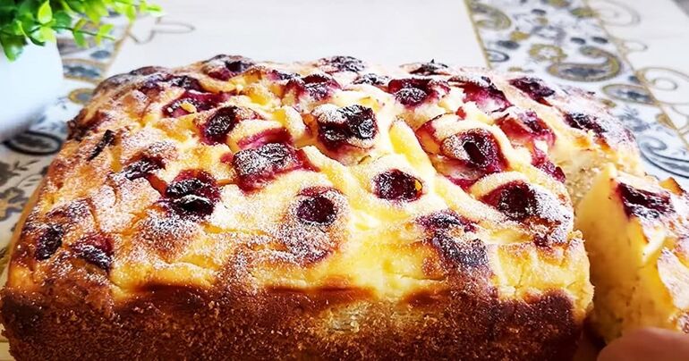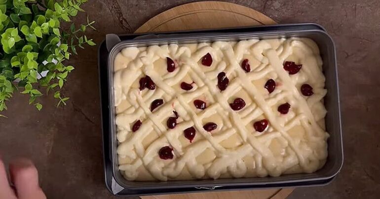 Форму с пергаментом наполняю тестом, поверх отсаживаю сетку из творожной массы. Добавляю вишню. Пеку при 180° до готовности.