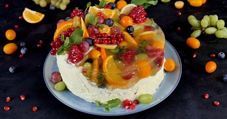 - Украсьте торт оставшимися фруктами и ягодами. Оставьте торт для пропитки в холодильнике.