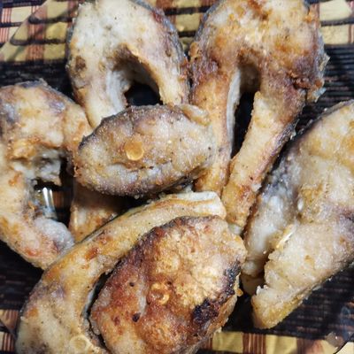 Затем соединяют кукурузную и пшеничную муку в равных долях, обваливают в этой смеси каждый кусок рыбы. Далее каждый кусочек погружают в холодную воду и сразу кладут в сковороду с разогретым маслом. Масло не шипит и не разбрызгивается, а панировка не подгорает.