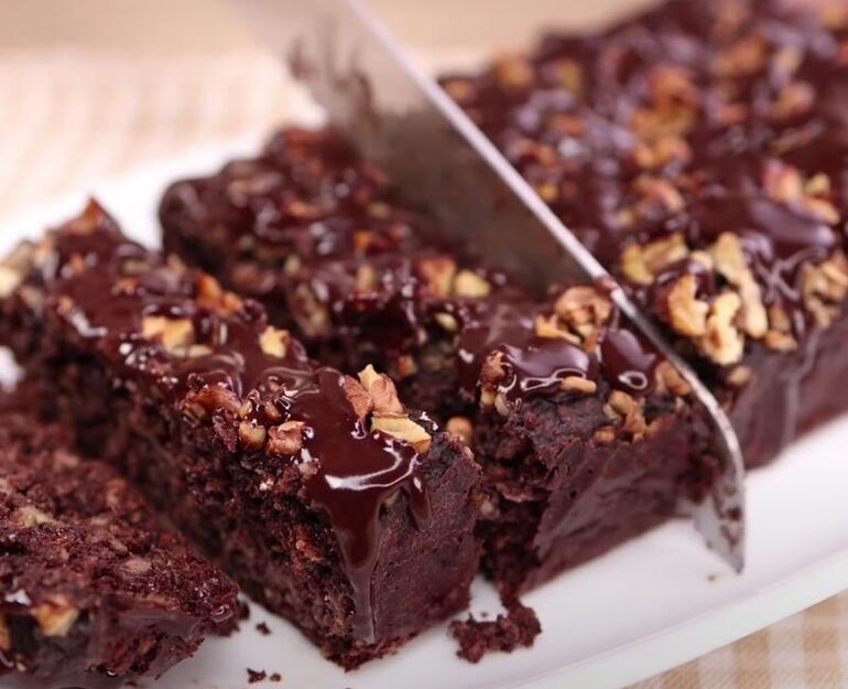 Возьмите кусочек масла и обильно смажьте форму для запекания. Вылейте половину теста, насыпьте орехи с шоколадом и залейте остальным тестом. Поставьте в разогретую духовку. Время выпекания — 20 минут.