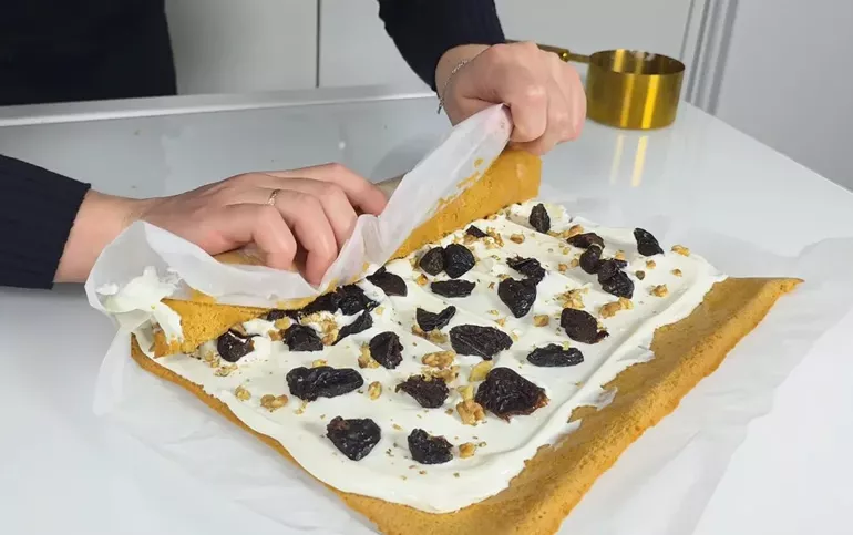 - Начинка. Разверните бисквит, щедро смажьте кремом (оставив край в пару сантиметров свободным). Рассыпьте измельченный чернослив и орехи. Сверните рулет обратно.
