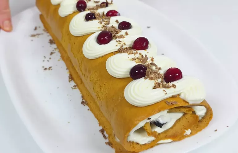 - Сборка. Пока корж теплый, сверните его в рулет прямо в пергаменте (или полотенце) на 5 минут, чтобы он «привык» к форме. В это время взбейте сметану с пудрой и сыром.