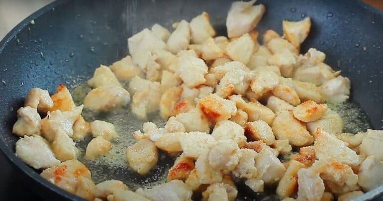 Куриное филе нарезаю небольшими кубиками и обжариваю на растительном масле до румяности. Приправляю солью, сушеным чесноком и карри.