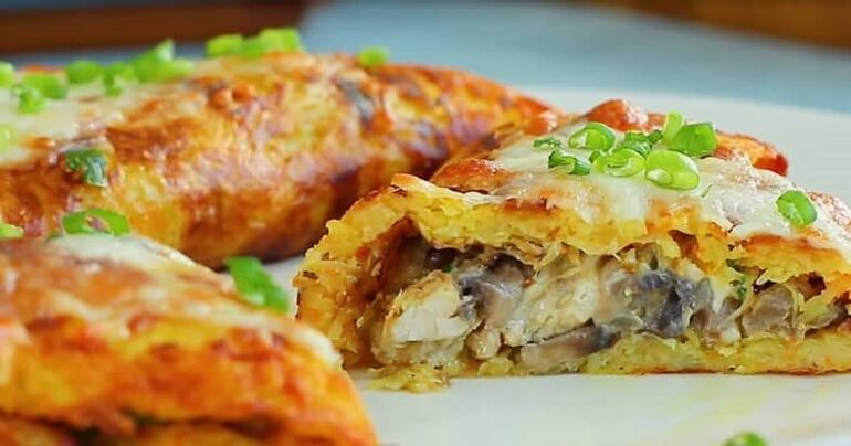 На готовые картофельные лепешки кладу начинку, посыпаю тертой моцареллой и сворачиваю конвертом.
