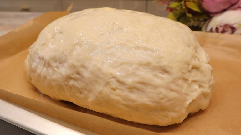 Выложите массу на стол и интенсивно вымешивайте. Верните в миску, накройте пленкой и дайте «отдохнуть» 40 минут. После этого еще раз тщательно промесите тесто — вы удивитесь его воздушной текстуре.