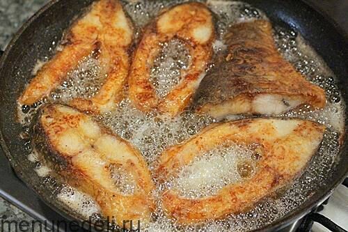 Смешайте пшеничную и кукурузную муку в равных пропорциях и обваляйте в этой смеси по очереди все кусочки. После быстро окуните рыбу в холодненькую водичку и сразу выкладывайте на тщательно разогретую сковородку с растительным маслом.
