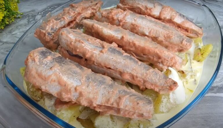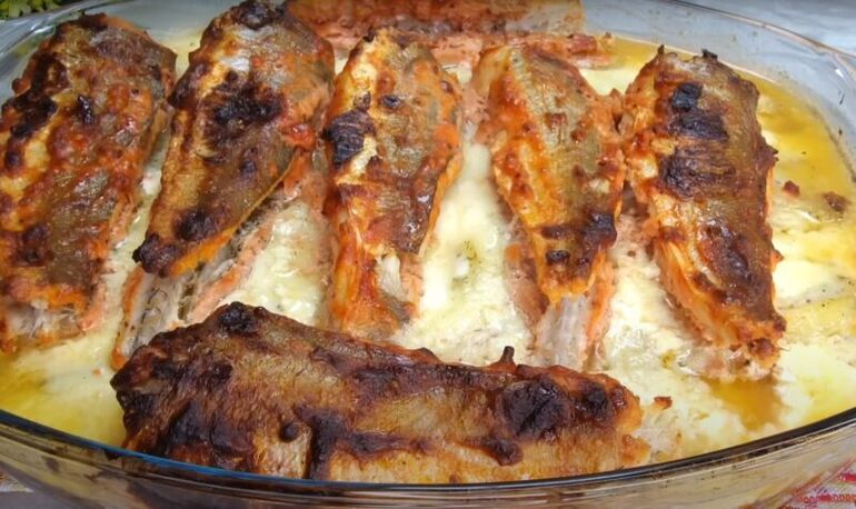 Для соуса яйца взбивают с сметаной и заливают картошку с сыром. Маринованную рыбу аккуратно укладывают сверху и накалывают на шпажки. Форма накрывается смоченным пергаментом и ставится в разогретую до 200 градусов духовку на 35 минут.