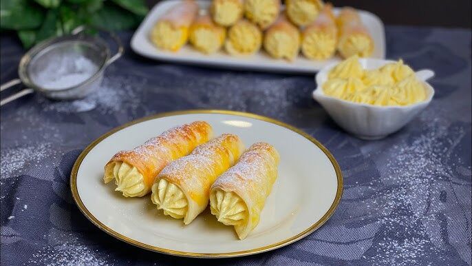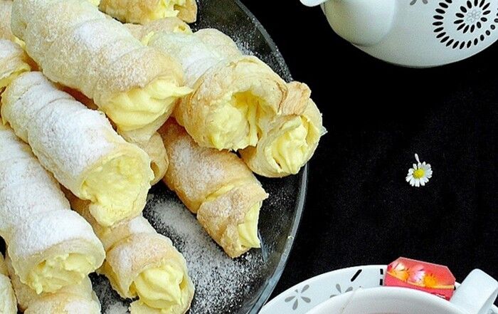 Лучше всего с таким кремом сочетаются рулеты. Приготовить их тоже несложно. Классику – слоеное тесто умеют готовить даже начинающие хозяйки, поэтому мы не будем перегружать этой информацией. В крайнем случае, полкило слоенки можно купить в любом кулинарном магазине, чтобы не возиться дома.