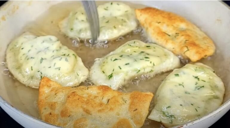 Между двух кругляшков теста кладем остывшую картошку и залепляем края. Осталось обжарить пирожки-лепешки на сковороде, пока на тесте не появится золотистая корочка.