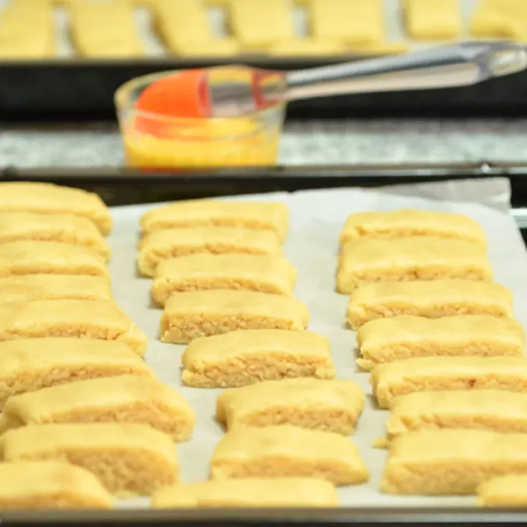 Разложите печенье на противне с пергаментом. Выпекайте в разогретой до 180°C духовке примерно 15 минут. Приятного чаепития!