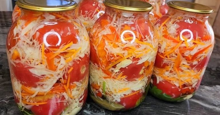 Сначала мелко нашинкуйте капусту. Помидоры вымойте и обсушите. На дно стерильной трехлитровой банки положите слой капусты, добавьте пару лавровых листьев и несколько горошин перца. Затем разместите ряд помидоров. Продолжайте чередовать овощи, пока банка не заполнится до верха.