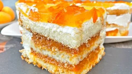7. В кулинарное кольцо нужно поместить тесто. Распределите сверху половину крема и разровняйте его. На кремовый слой выложите половину абрикосовой начинки.