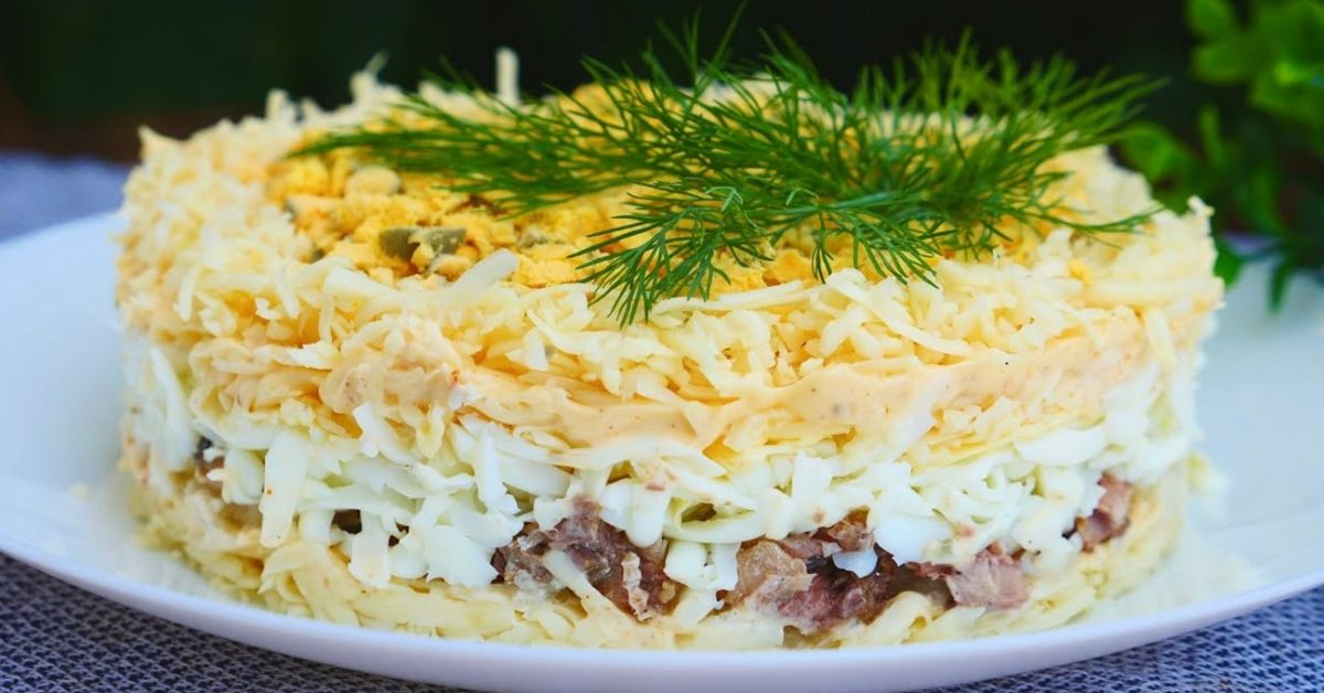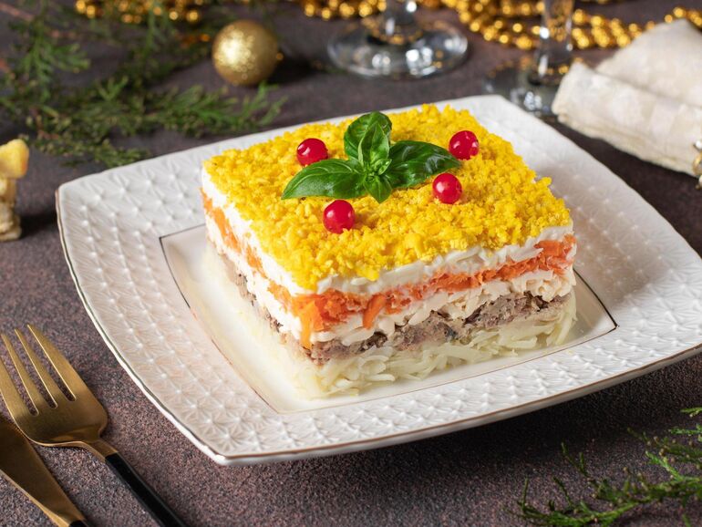 Можно использовать кулинарное кольцо, чтобы салат получился более аккуратным.