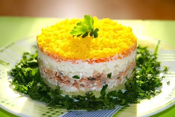 Конечно же, сверху нужно сделать сеточку из майонеза.