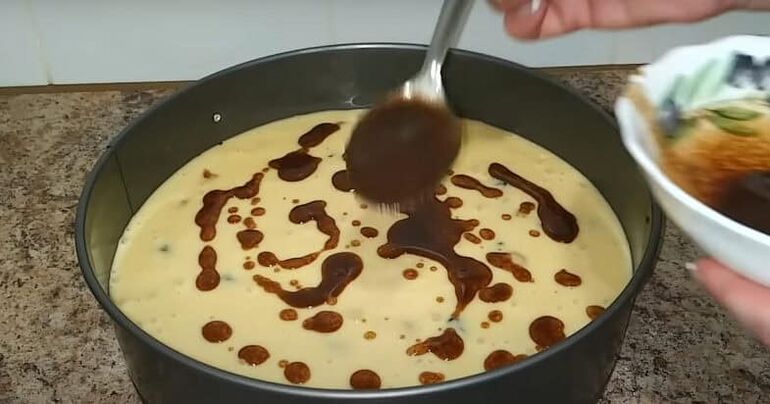 Форму застелите пергаментом. Перелейте в нее тесто и распределите его. Сверху полейте сиропом. Поставьте в духовку, прогретую до 180 градусов на 30-35 минут. Степень готовности проверяйте деревянной палочкой.