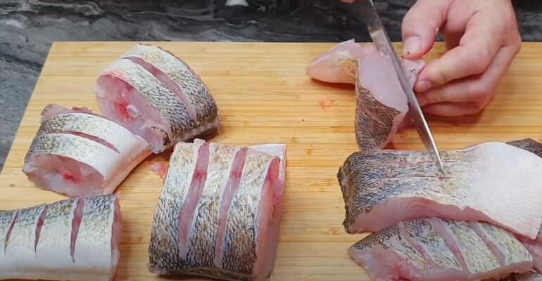 Сначала отделяем у судака голову и хвост, делаем надрезы по бокам рыбы и разделяем ее на порции, убирая позвоночник. Перекладываем в миску, солим и оставляем на полчаса.