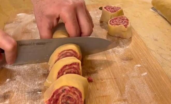 Нужно разогреть духовку до 150°C. Затем раскатать тесто и нарежьте порционными кусочками. В центральную часть пирожка выкладывается начинка, защипываются края и смазывается верх желтком.