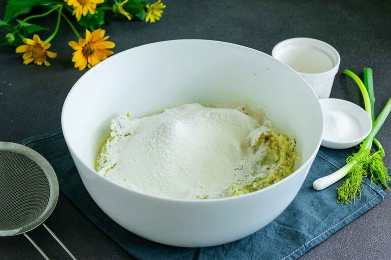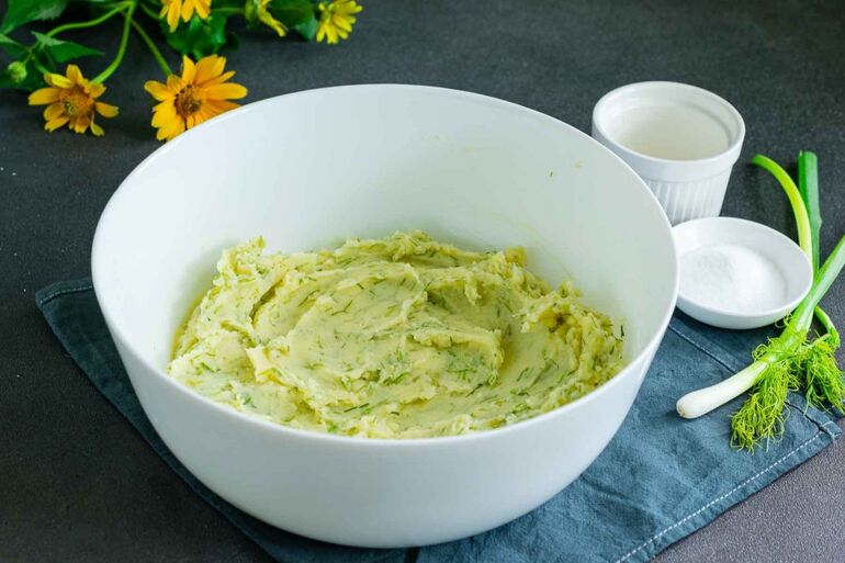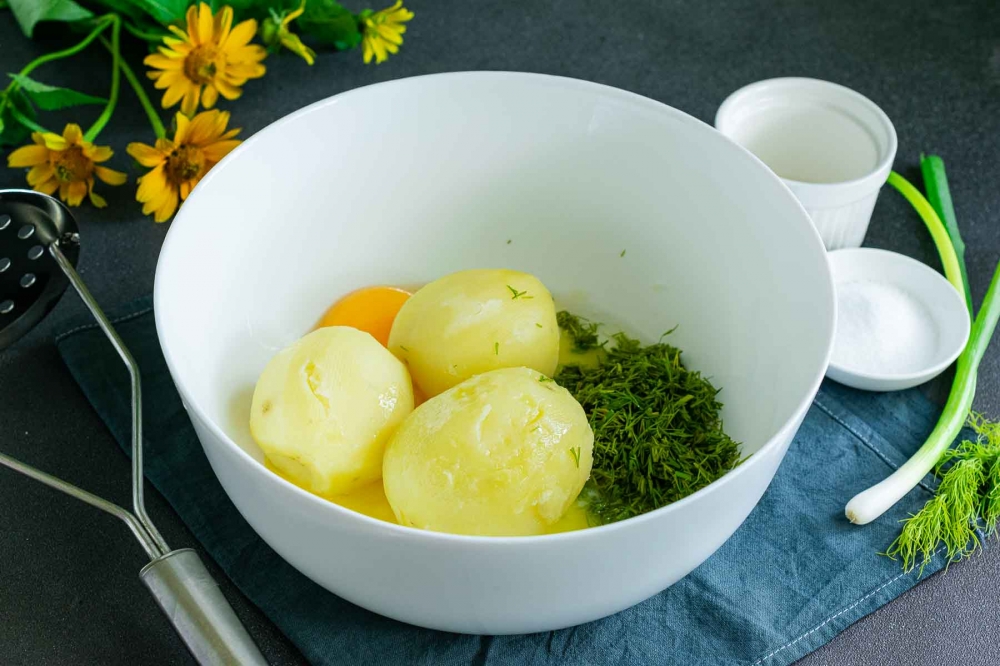 К готовой картошке добавьте яйцо, немного масла и измельченный укроп. Все это преобразуйте миксером в пюре, добавьте туда муку из пшеницы, немного разрыхлителя и специй.