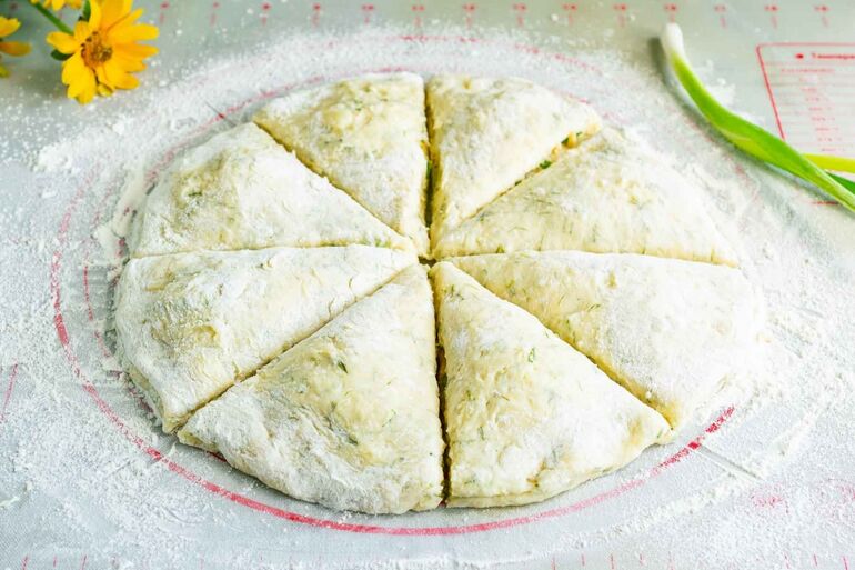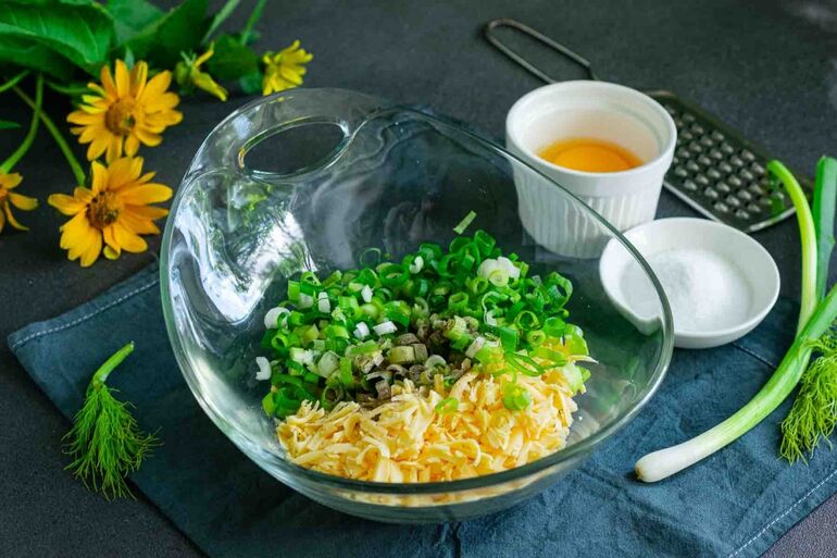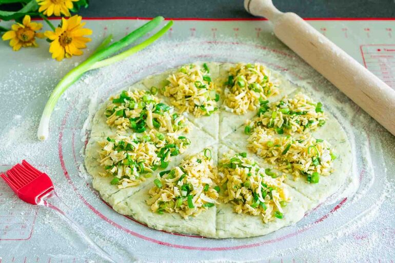 Из всего этого должно получиться тесто. Главная задача – его однородность, мягкость и упругость. Тесто накрывается пищевой пленкой и оставляется «отдыхать» на полчаса. Это время используйте для приготовления начинки. Сыр перетрите через максимально крупную терку, зелень нарежьте, по возможности, как можно мельче. Добавьте в начинку молотый перец, количество – в зависимости от ваших предпочтений остроты блюда.