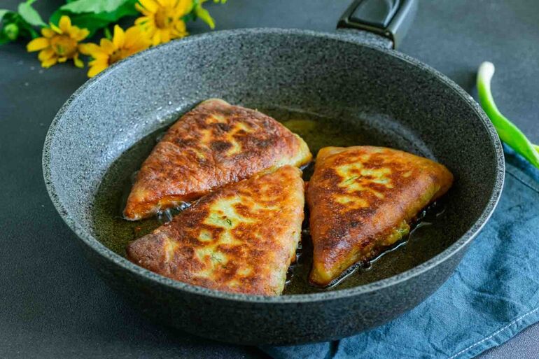 Оставшееся тесто раскатывается в такой же круг, которым накрываются полученные уже полуфабрикаты зраз. Края соединяются, сектора разрезаются, и остается только обжарить наши зразы на сковороде по десять минут дважды, на каждую сторону.
