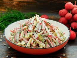 Крабовые палочки – очень популярный ингредиент для салатов, в сочетании со сладкой кукурузой, вареными яйцами, рисом и заправленный майонезом, салат из этих палочек часто встречается на праздничных столах, что совсем не удивляет – простые компоненты, достаточная калорийность, приятная консистенция – настоящее универсальное счастье, если нужно быстро сделать для компании что-то вкусненькое.