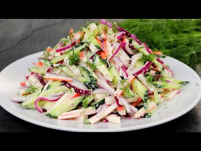 Для первой вам понадобятся сами палочки, сто граммов, стандартная упаковка, два огурца, одна луковица, яблочный уксус, соль-сахар.