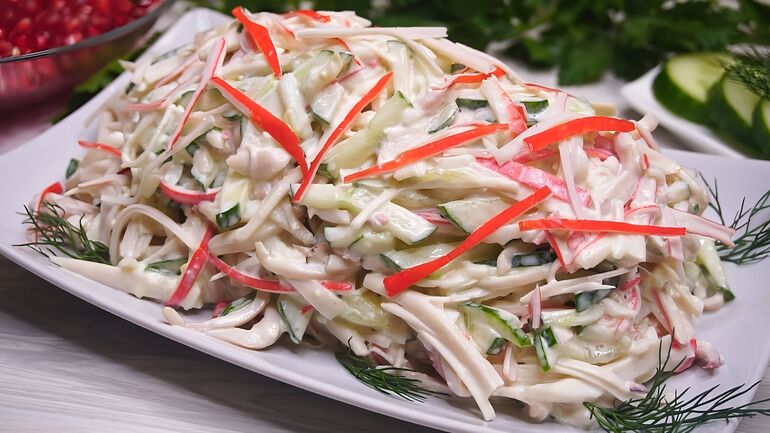 Но еще одно преимущество этого белкового продукта (надеемся, вы в курсе, что крабами в палочках и не пахнет) это то, что состав салатов из него можно легко, так сказать, импровизационно менять по своему усмотрению.