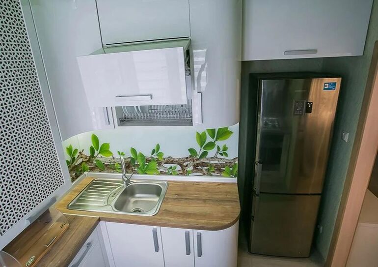 Этот пример еще раз доказывает: даже самая маленькая кухня может стать удобной и стильной, если подойти к планировке с умом и не бояться нестандартных решений.