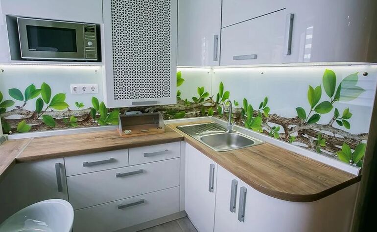 Фартук с фотопечатью сегодня уже выглядит немного устаревшим. Однако ремонт в квартире делали еще в 2016 году, когда подобные решения находились на пике популярности. Впрочем, в этой истории ключевую роль играет не декоративная часть, а именно планировка.