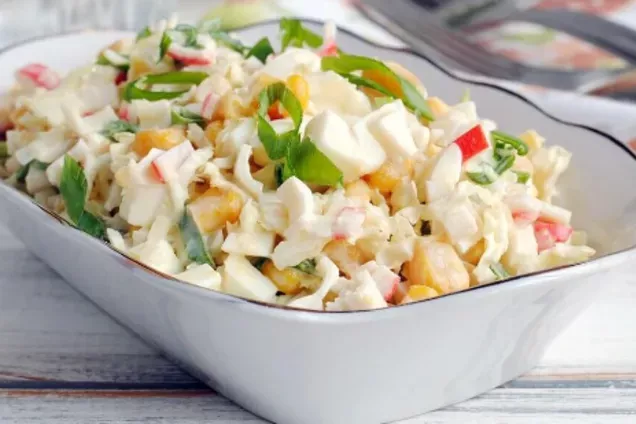 Здесь важна одинаковая нарезка — измельчите все компоненты средними кубиками. Это придаст салату приятную текстуру. Смешайте всё в салатнике, добавьте специи и майонез. Идеальный баланс свежести и сытности.